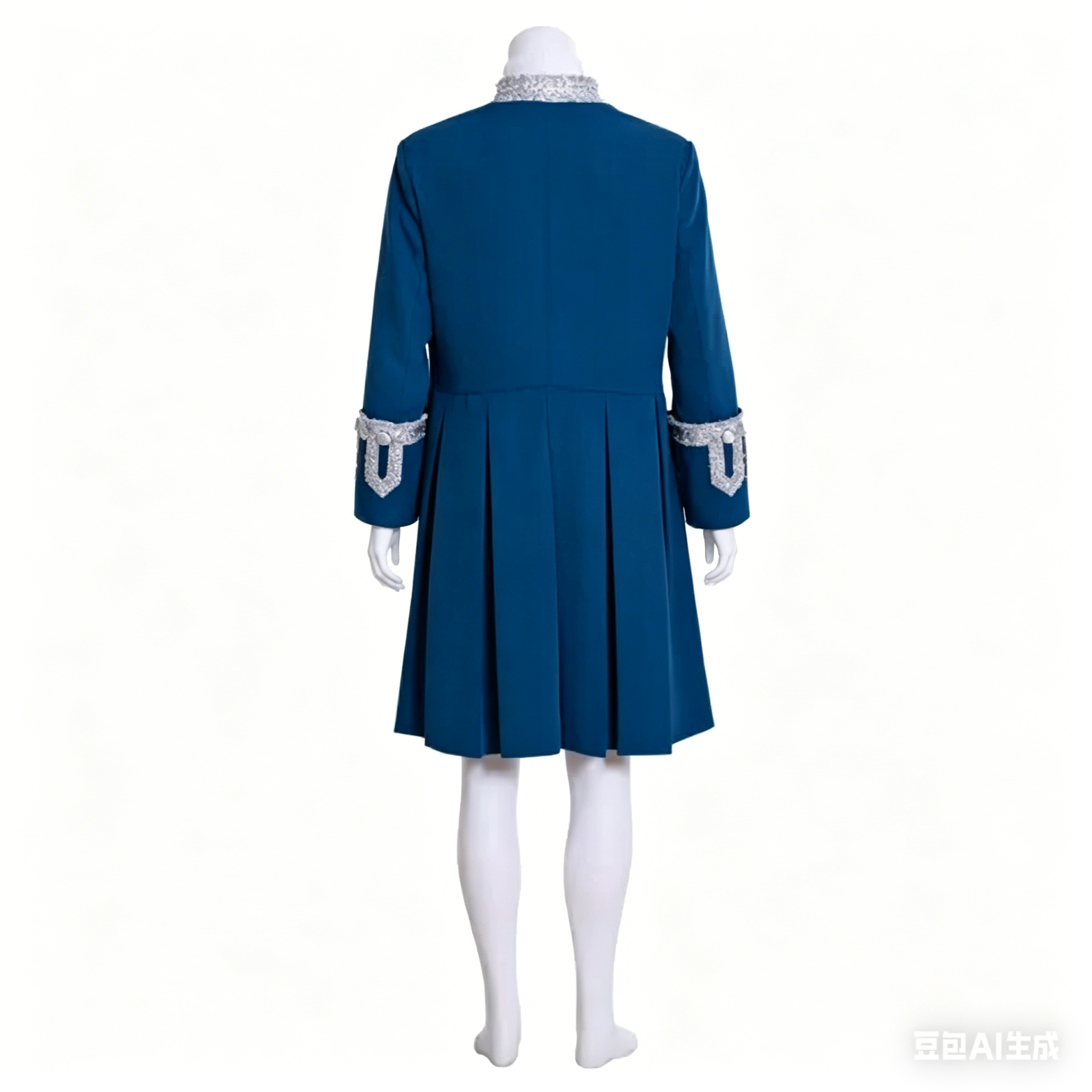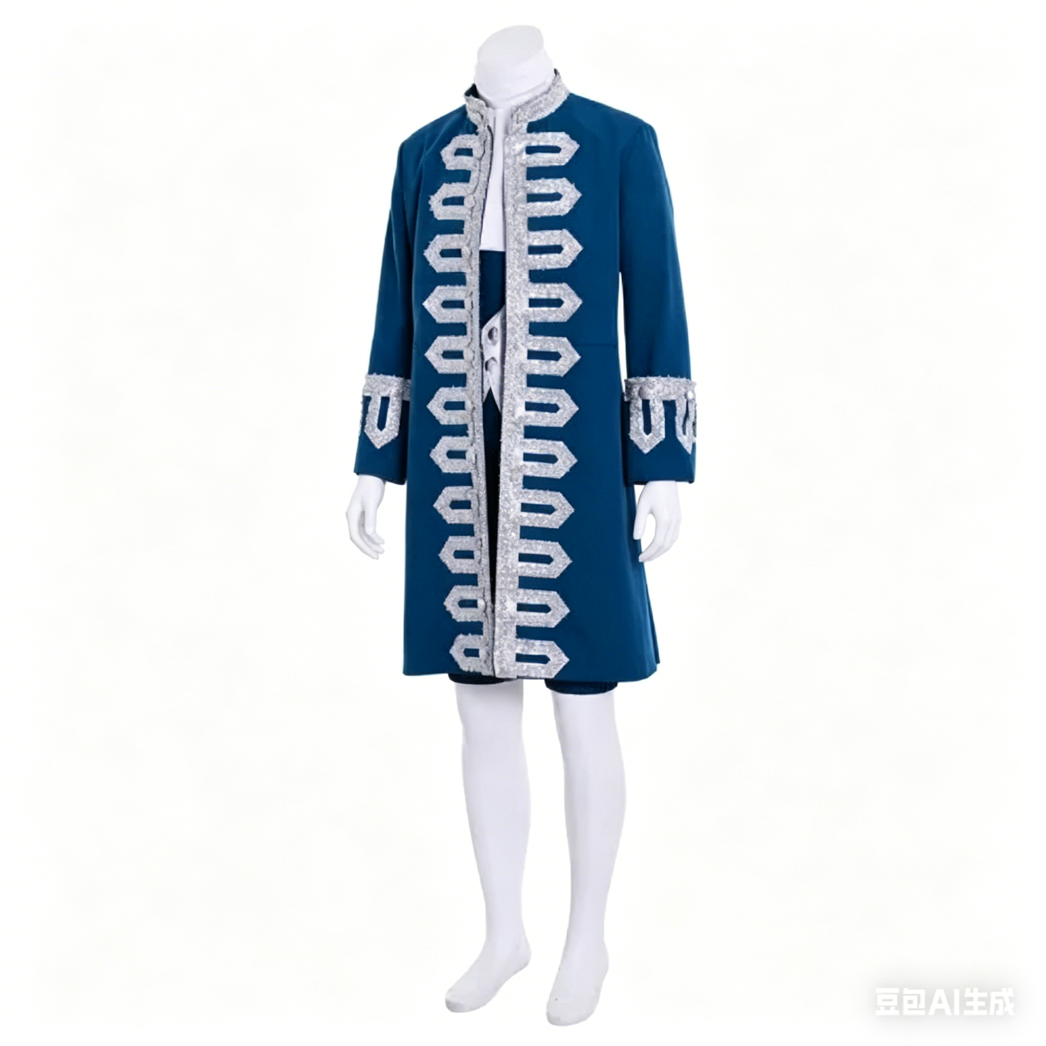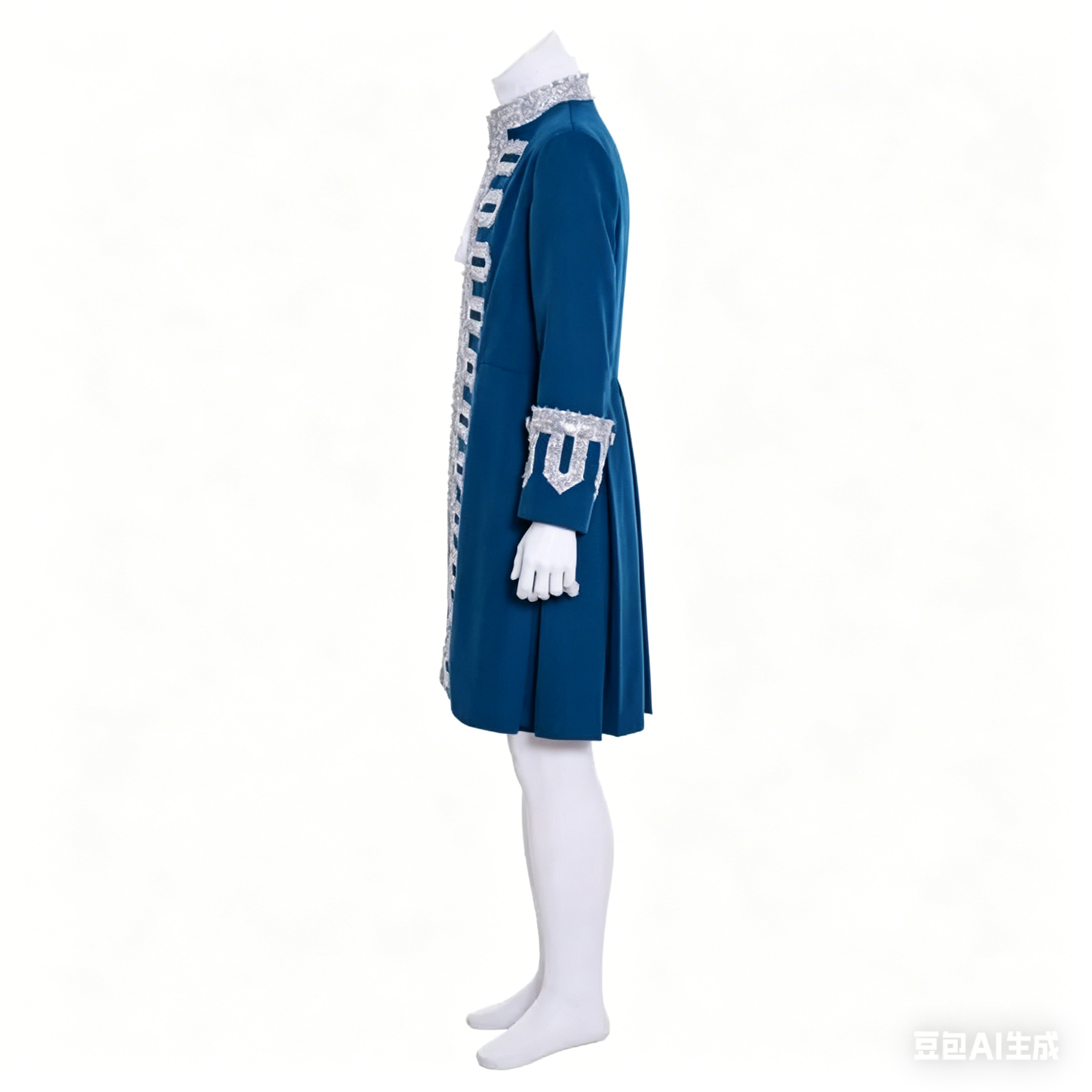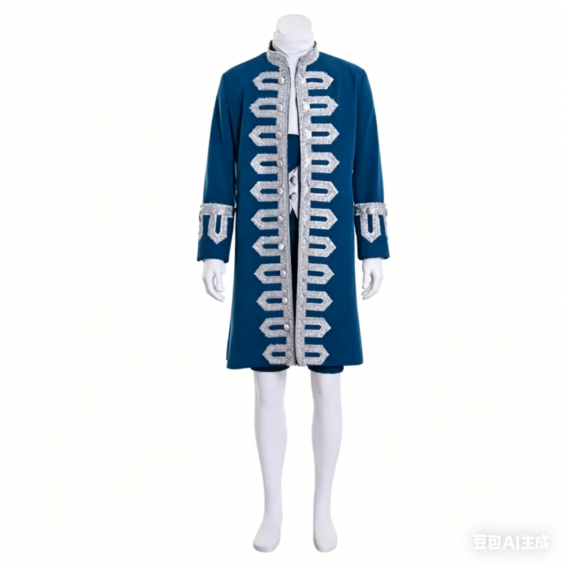 captures the essence of Rococo-era court fashion, featuring elegant tailoring, rich detailing and a timeless royal blue hue that embodies