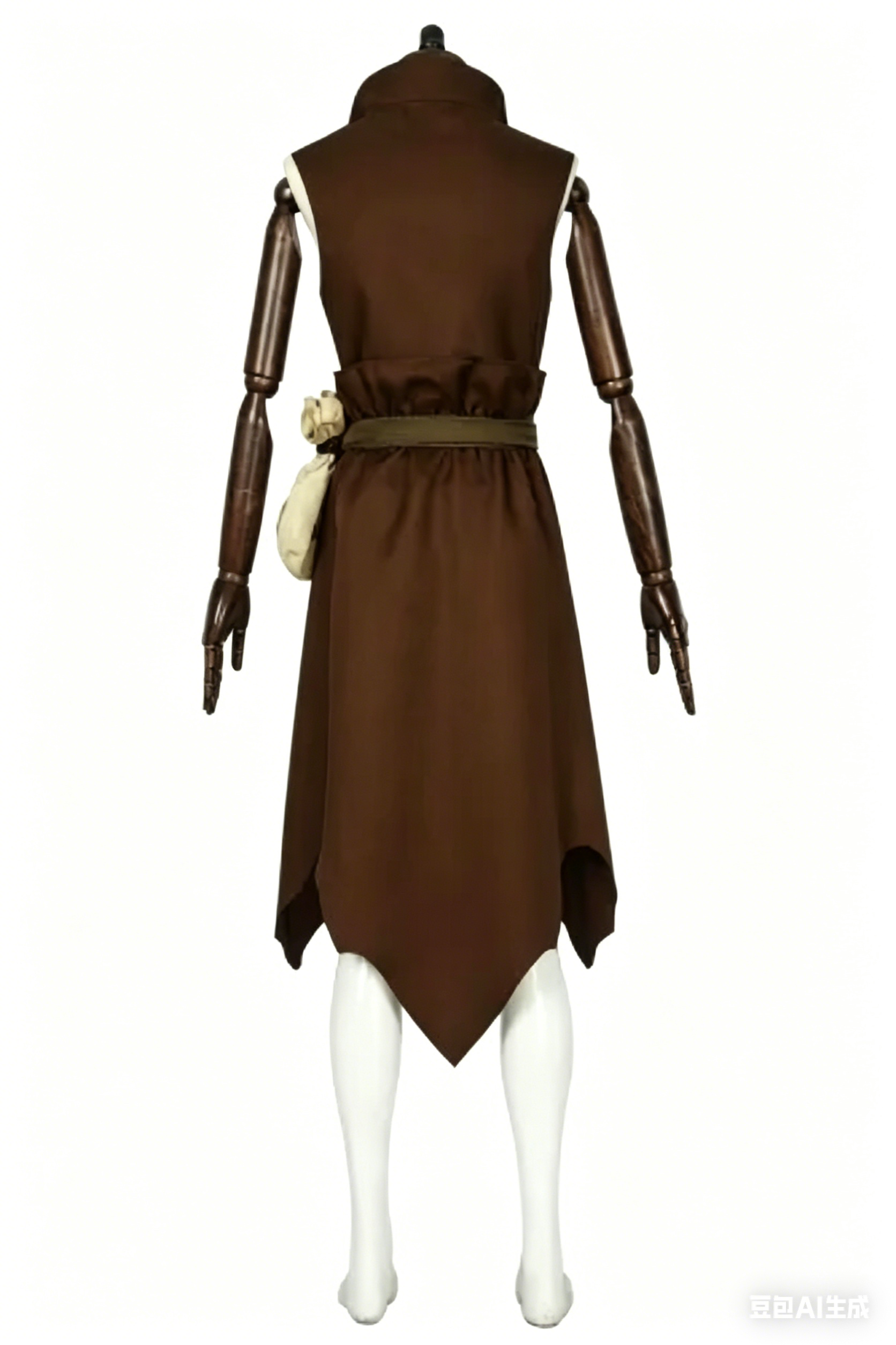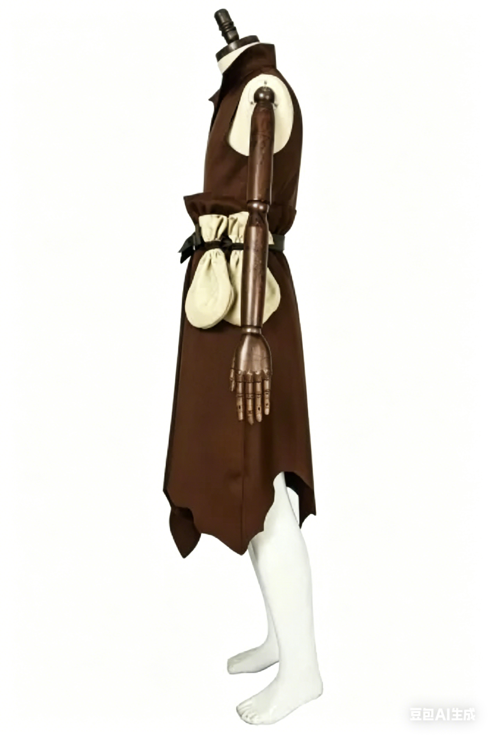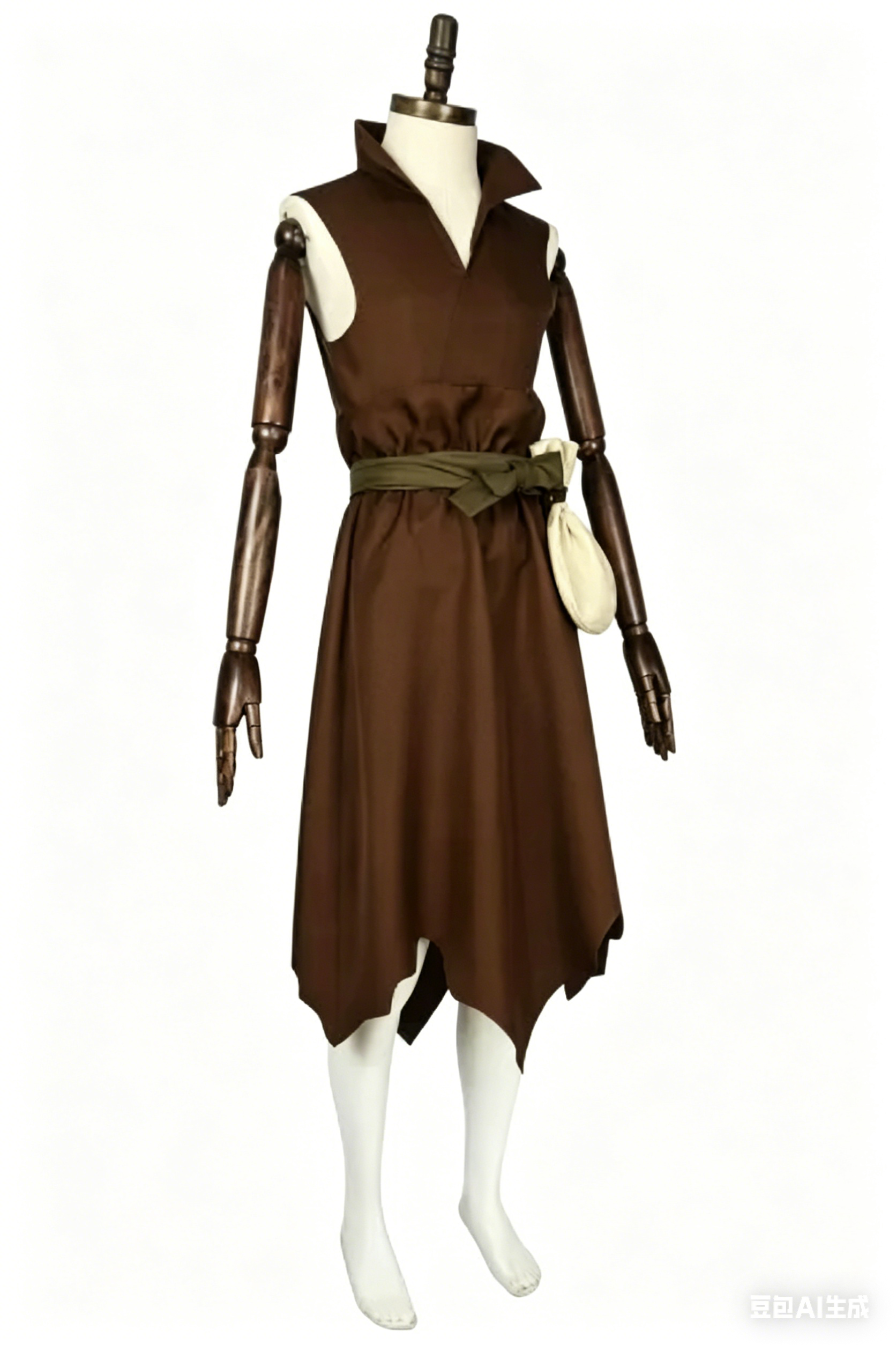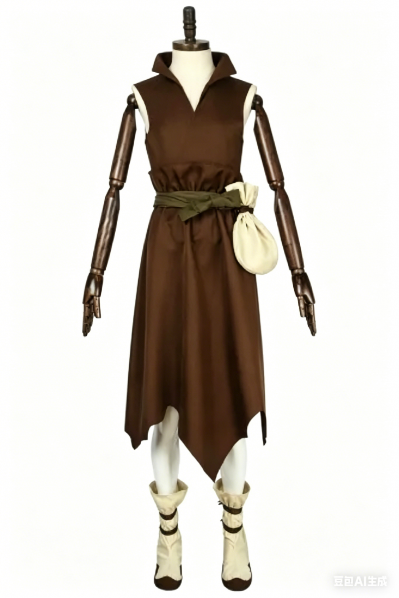 This premium cosplay suit features a sleeveless brown tunic with a folded collar, an olive-green belt with