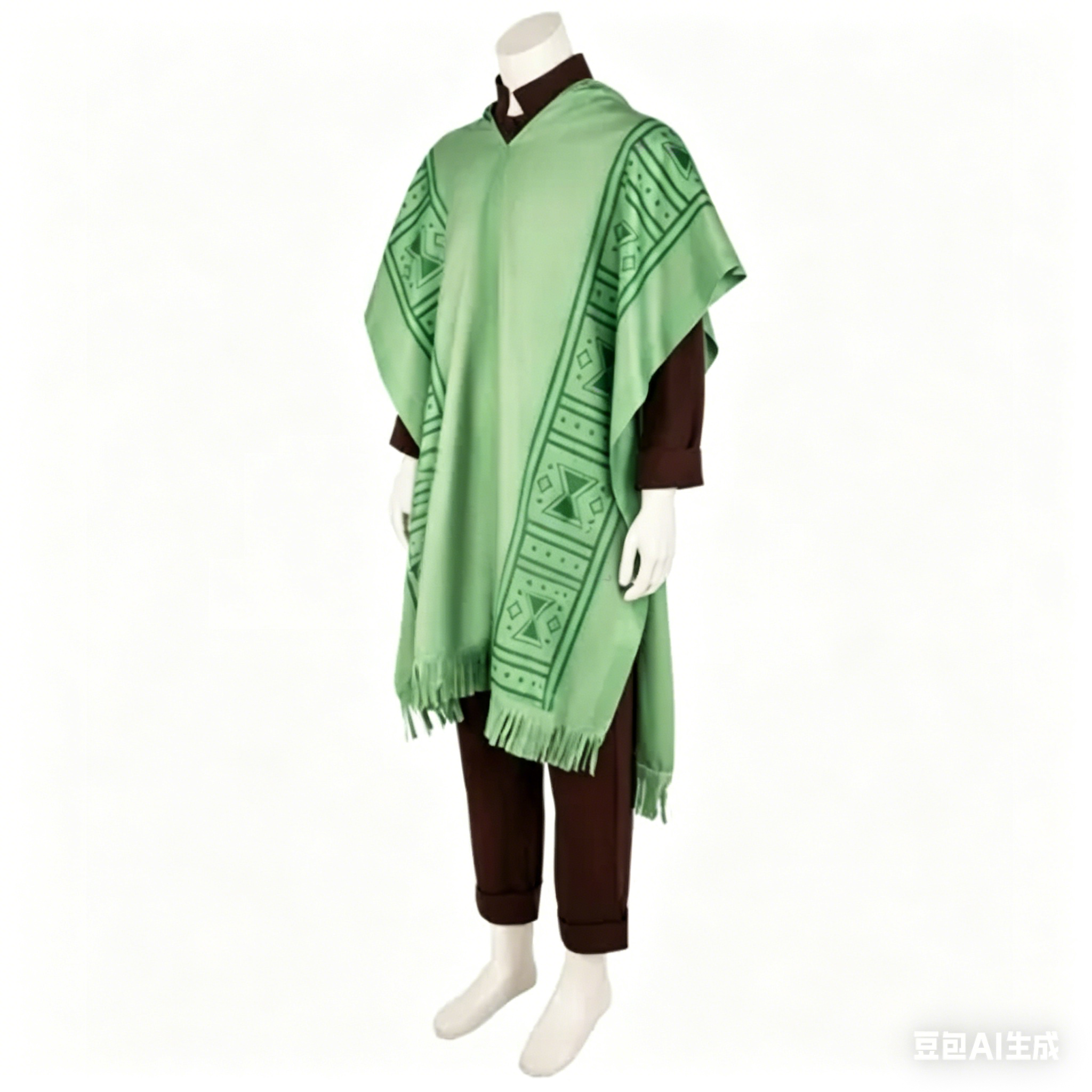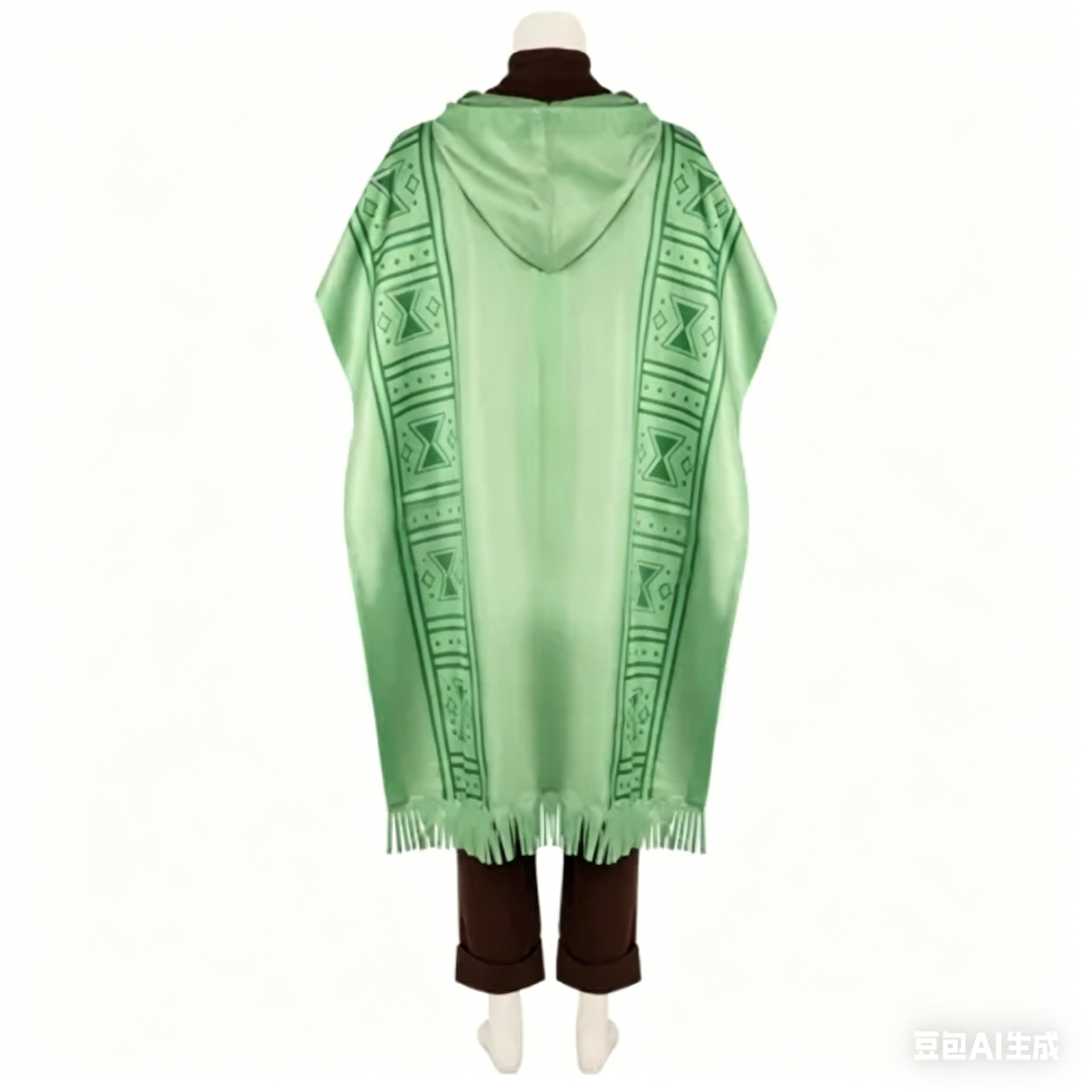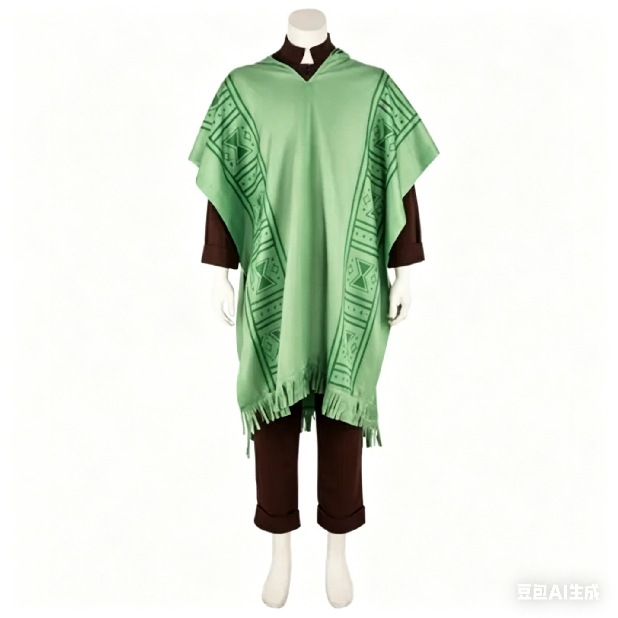 The hooded poncho features the same subtle textures and color palette seen in the film, while the tunic and pants mirror