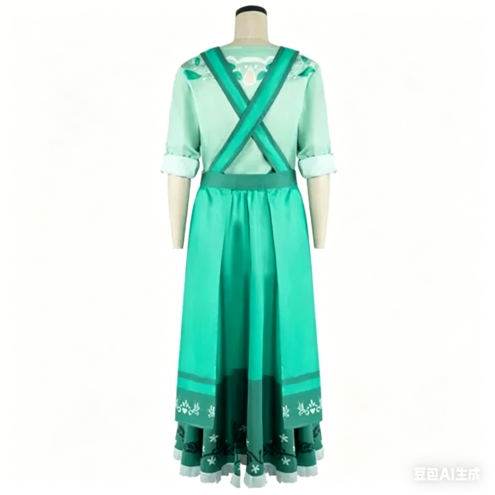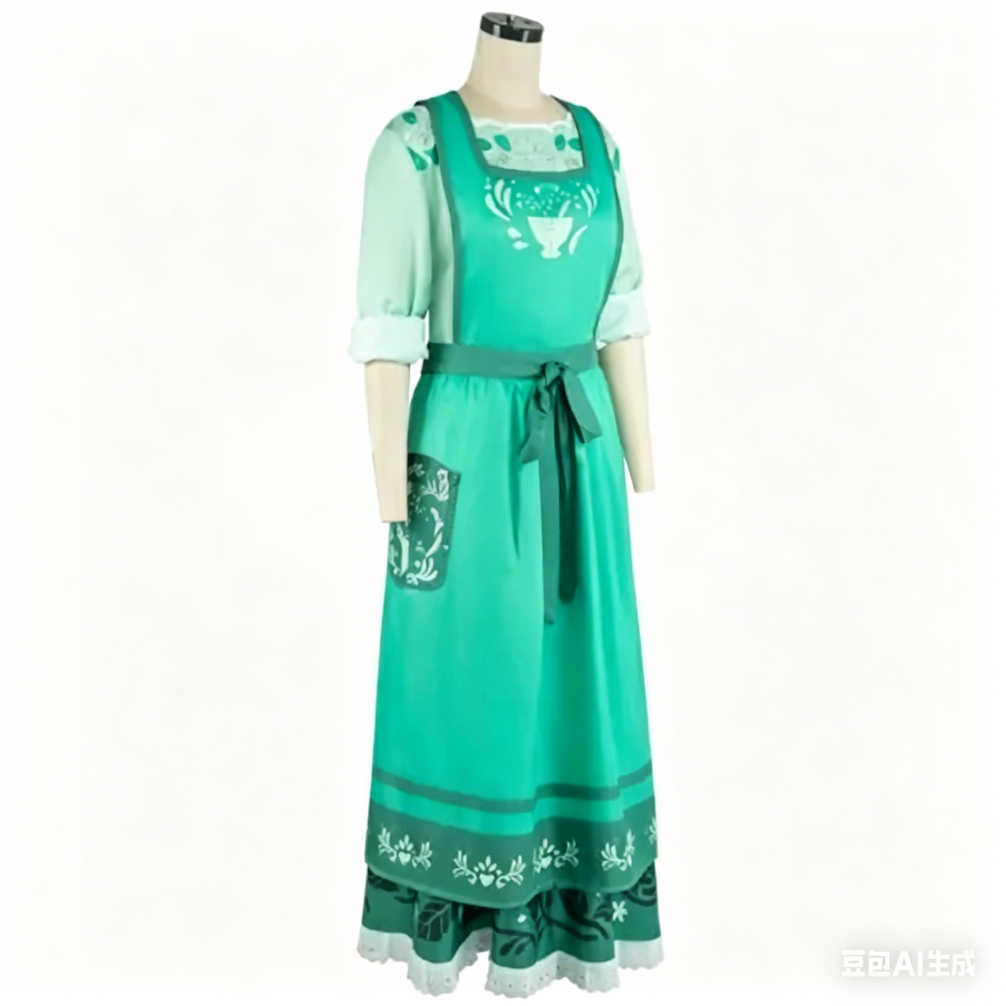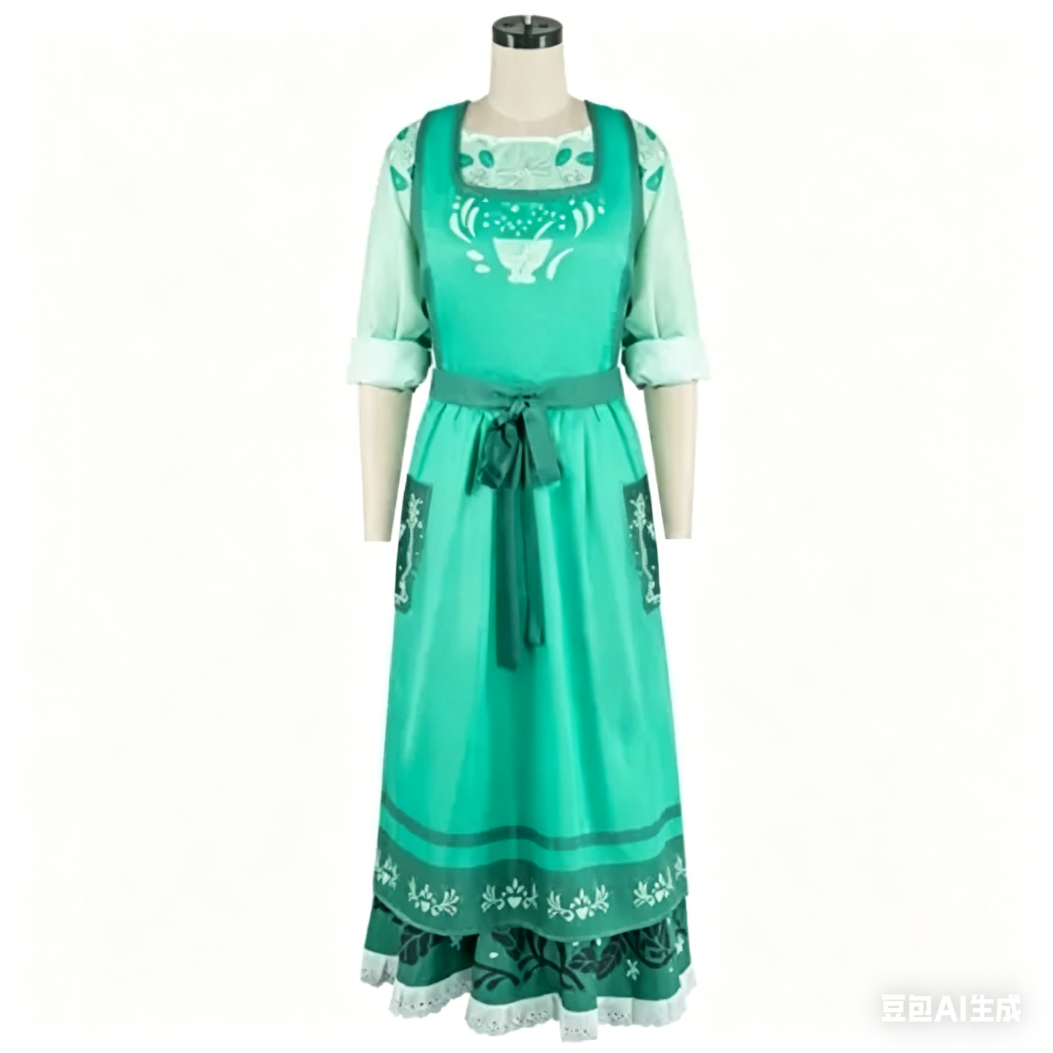 silhouette, paired with a matching apron (a key detail from the film) decorated with subtle floral accents, completing the