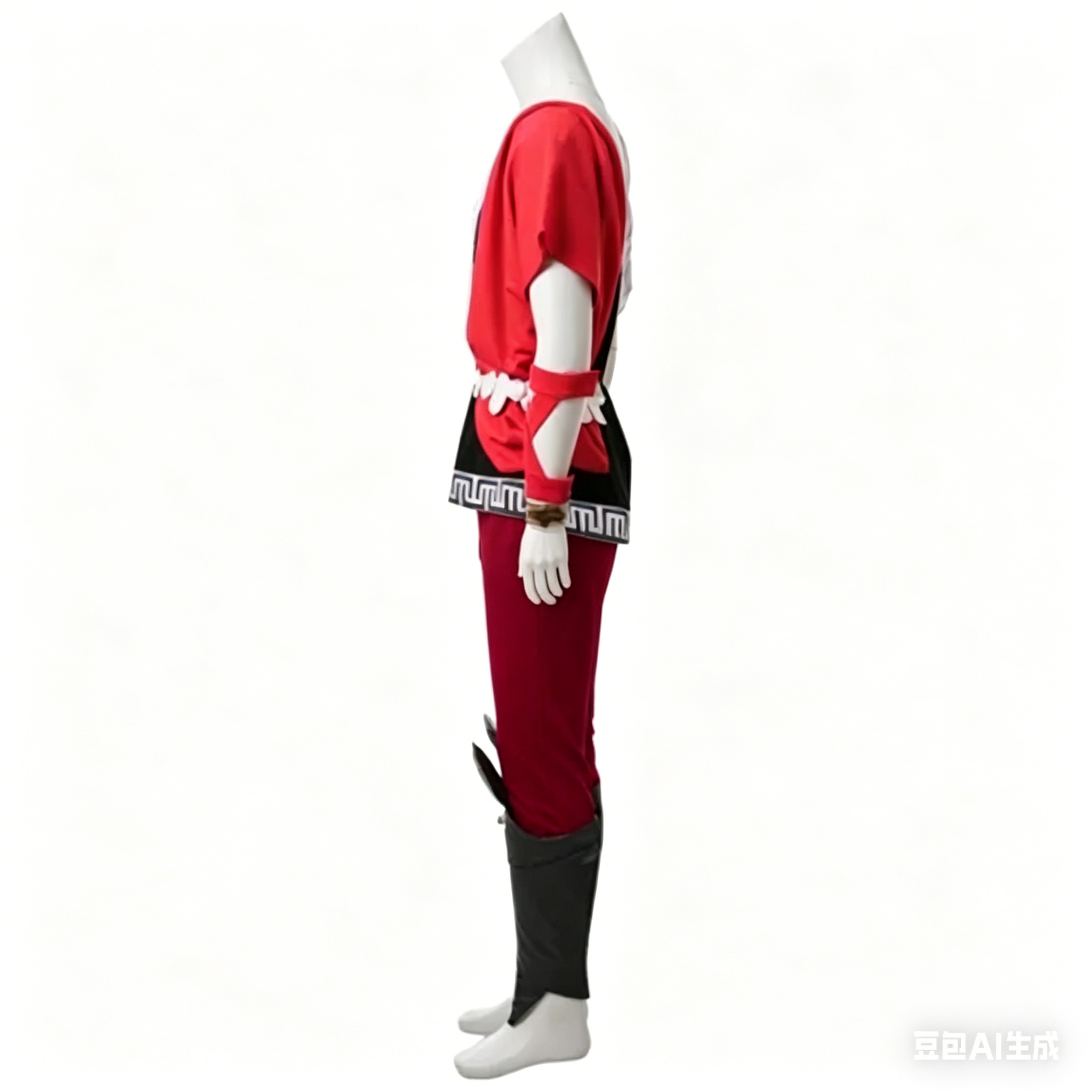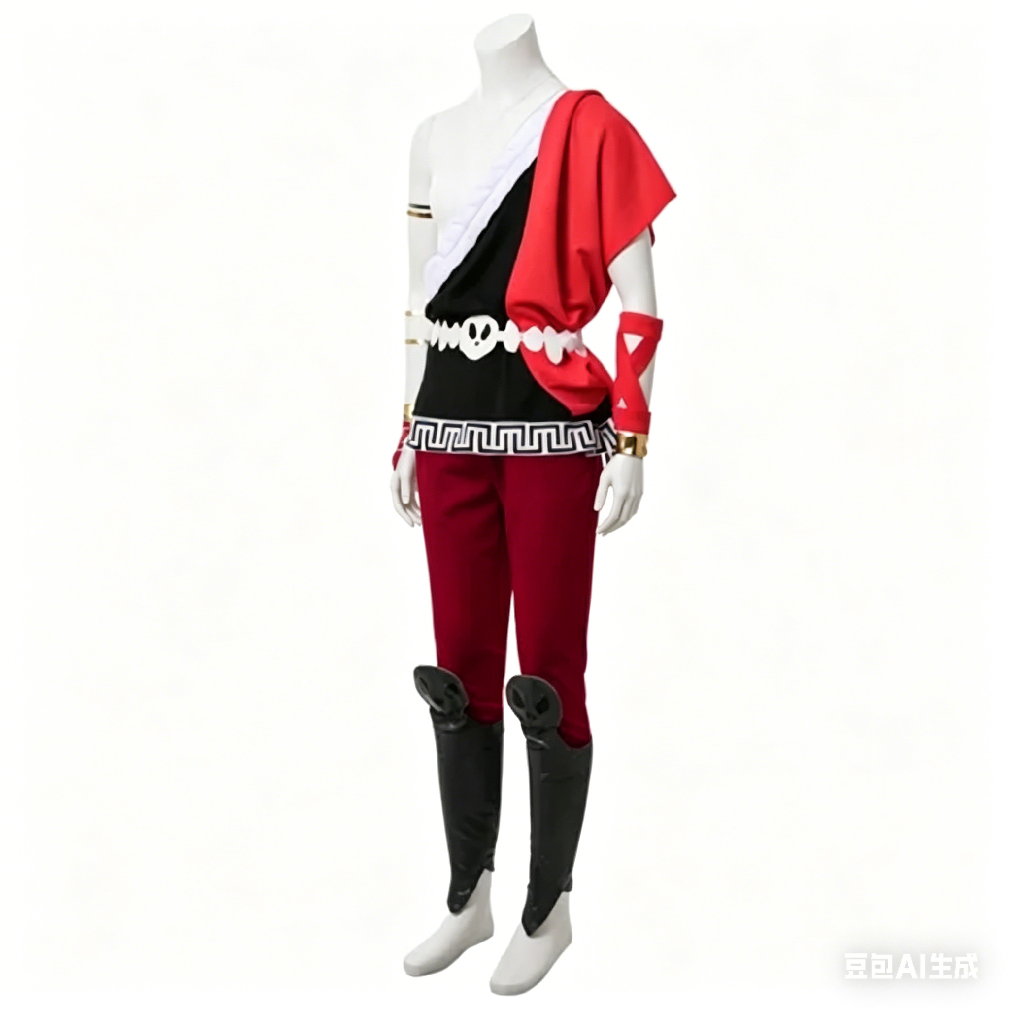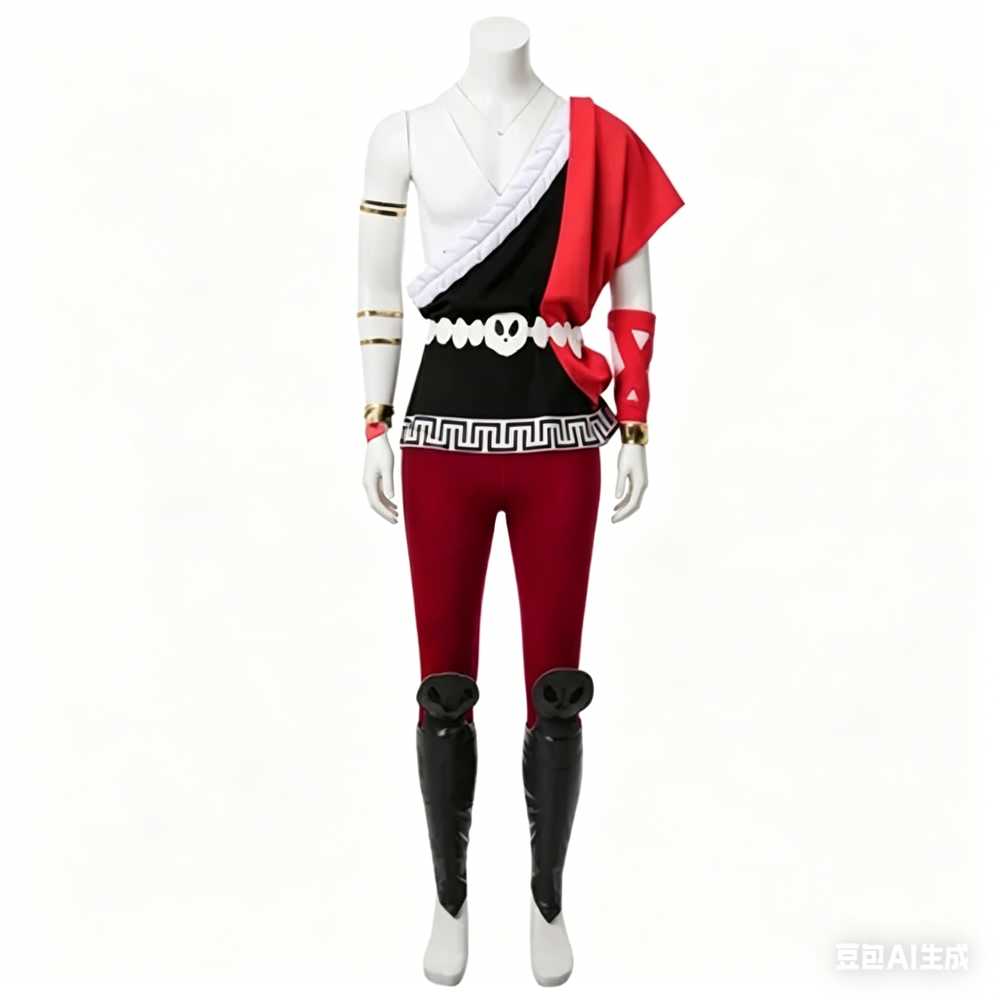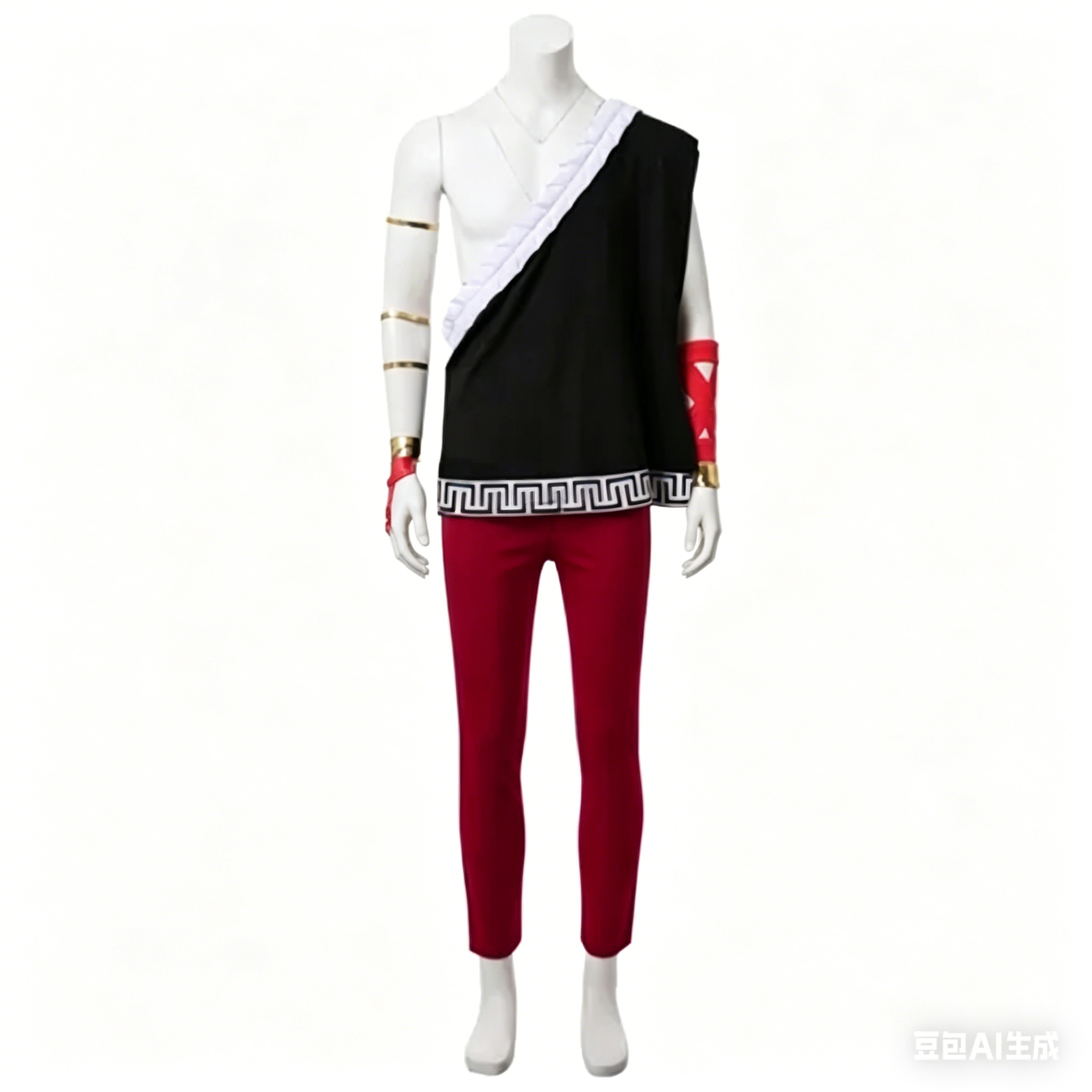 This detailed costume includes a one-shoulder tunic with classic Greek key trim, form-fitting red trousers,