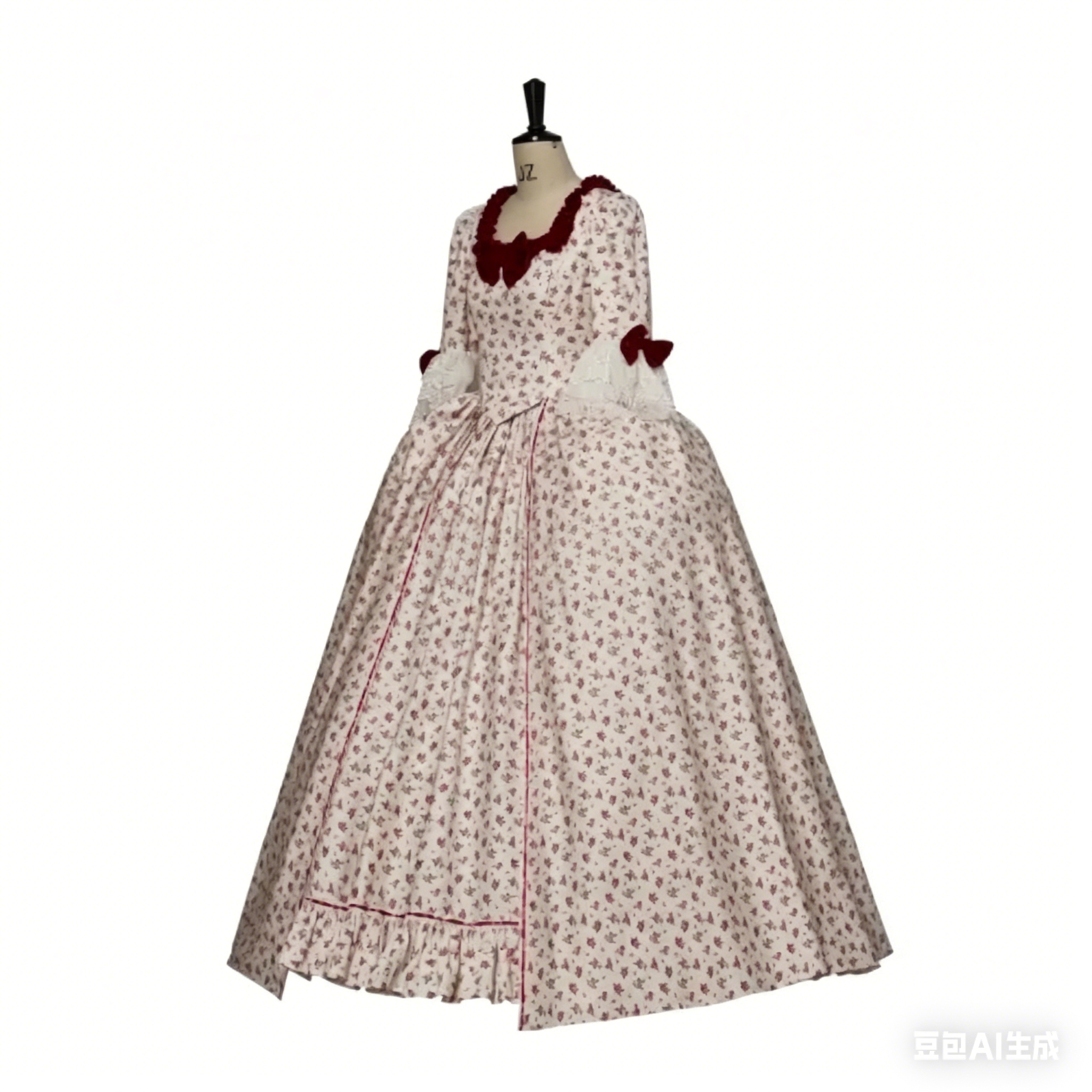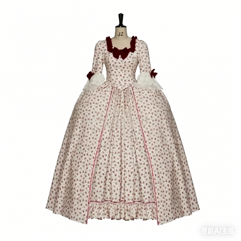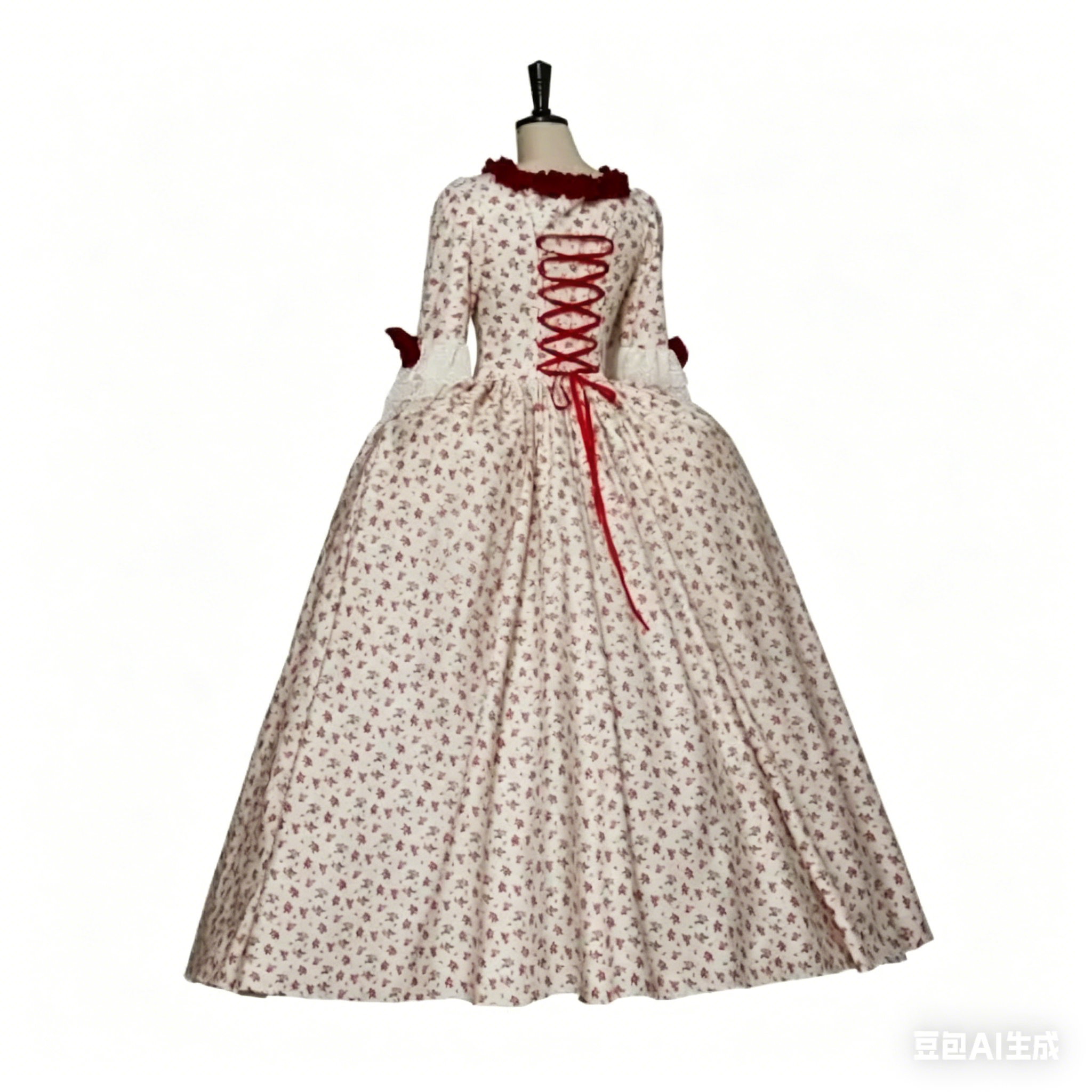 embroidery and lace accents—replicating the elaborate textiles and opulent details of Marie Antoinette’s royal wardrobe.