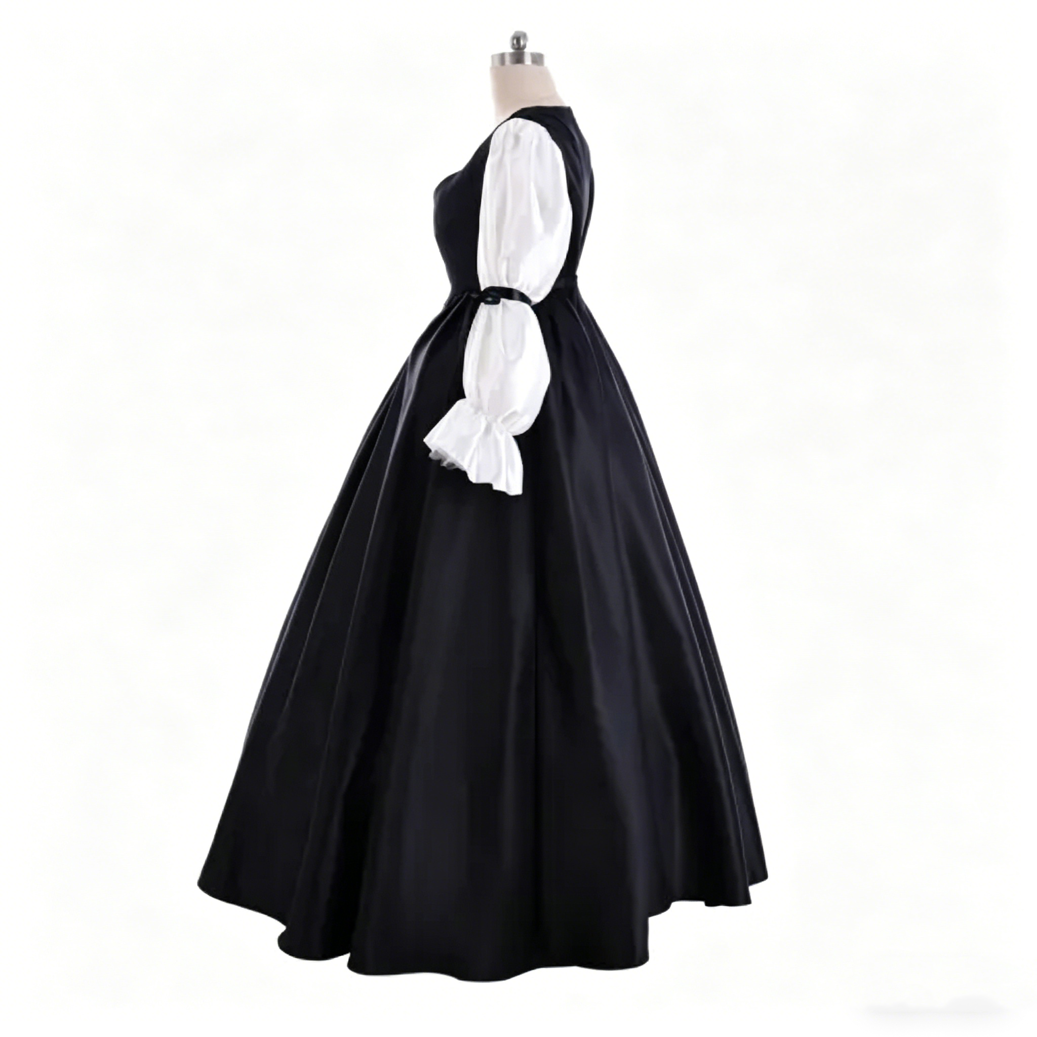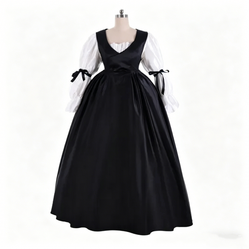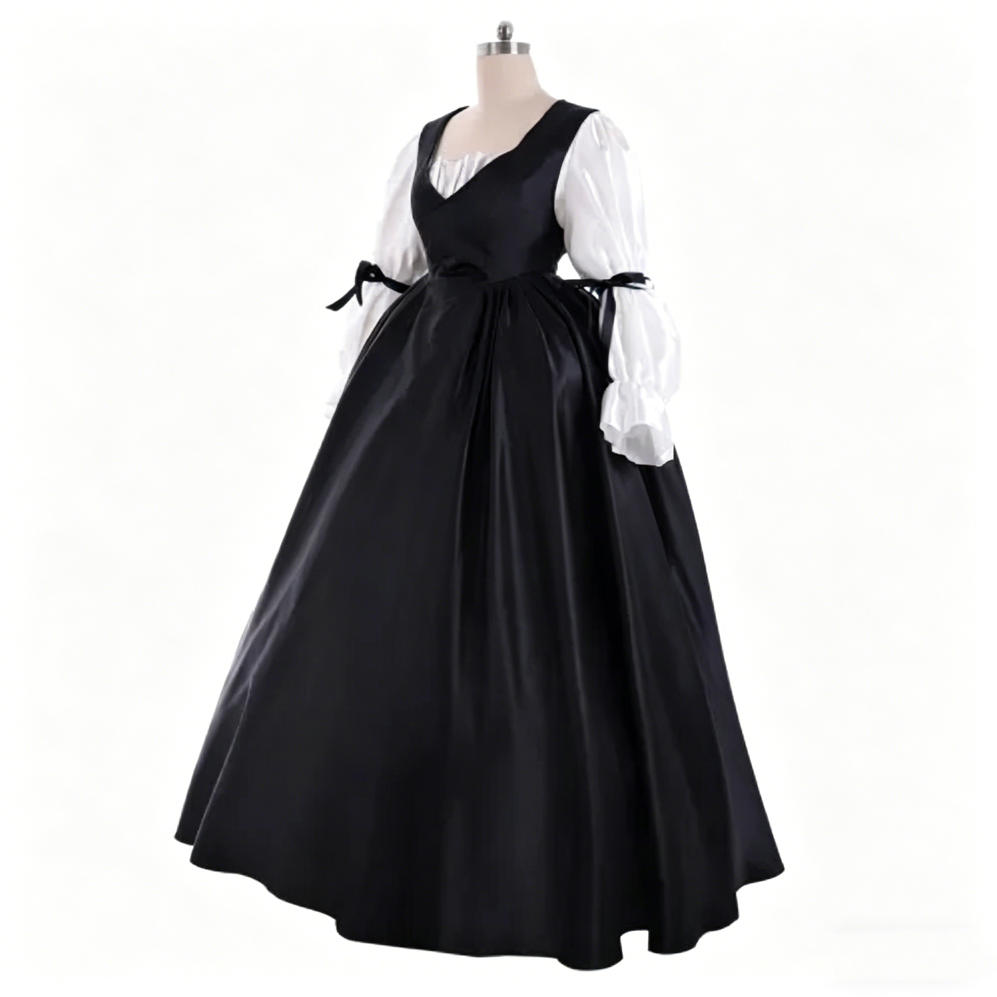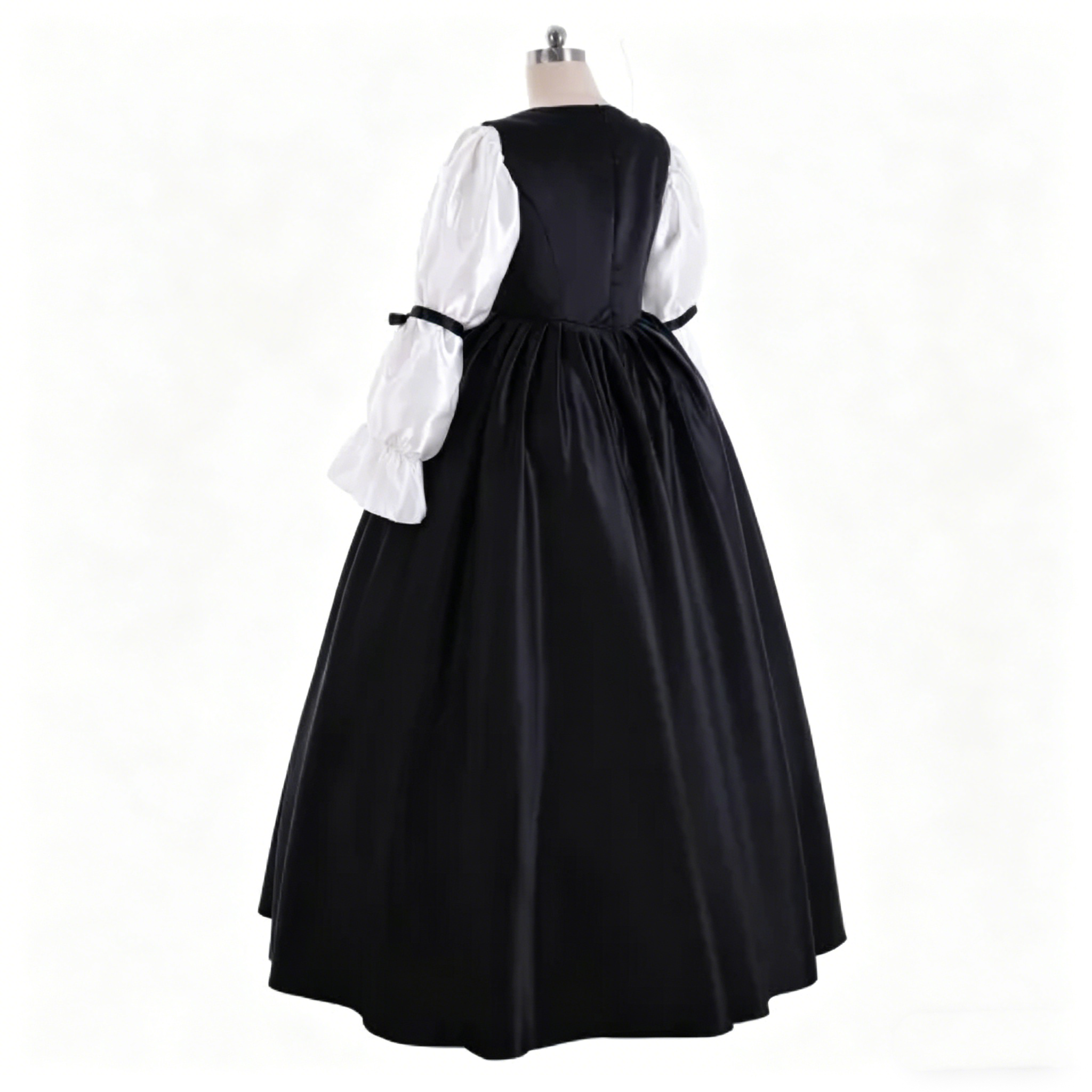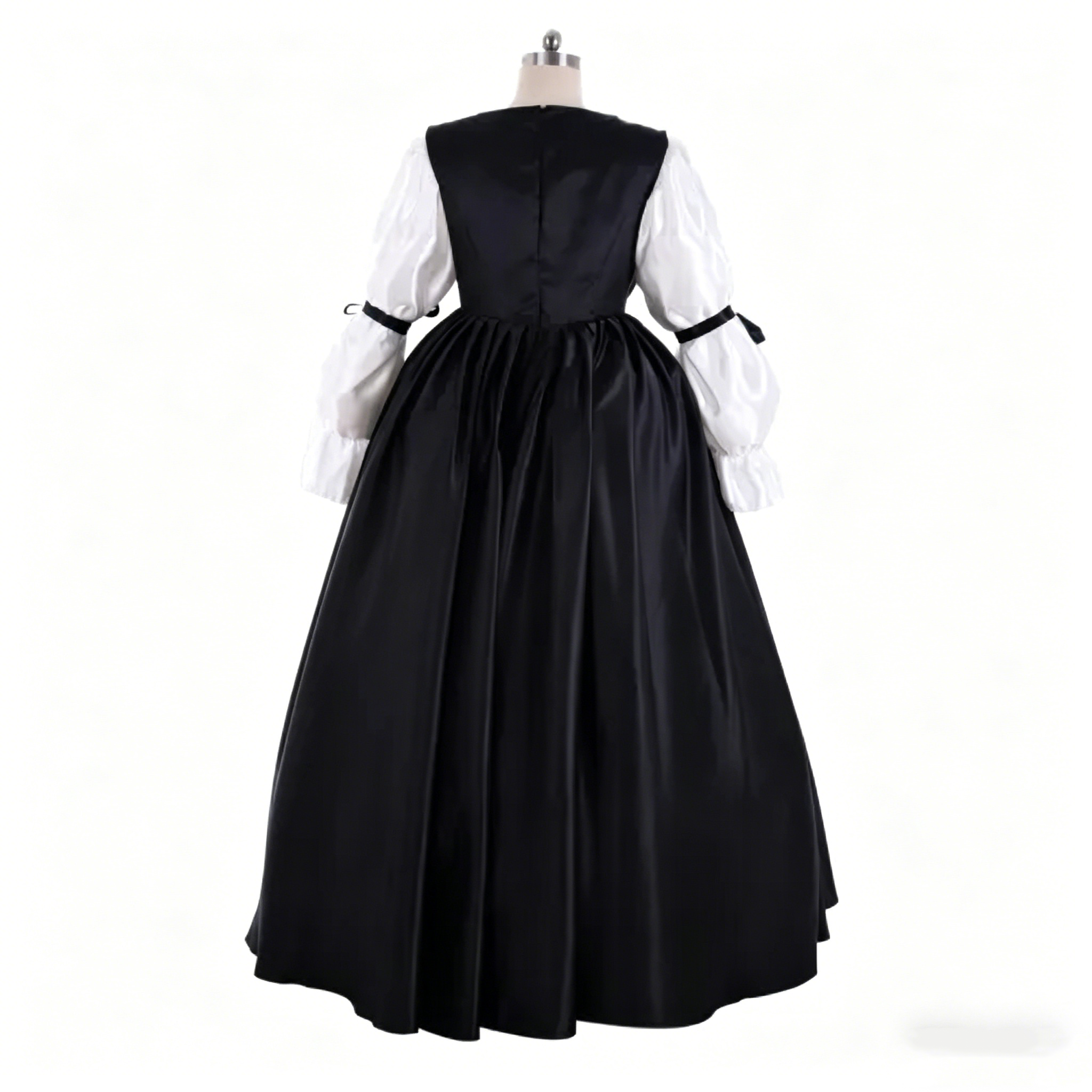 This stunning costume features a timelessColonial Black Dress silhouette, elevated with Rococo-inspired details