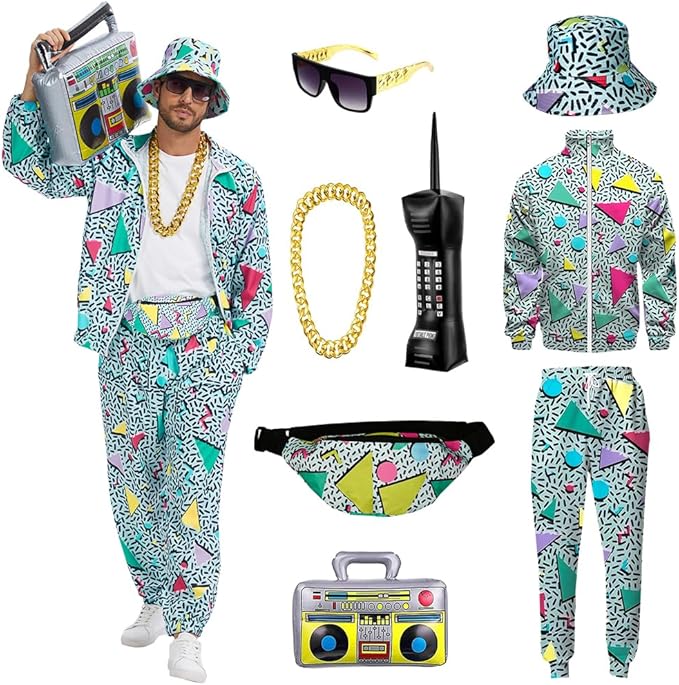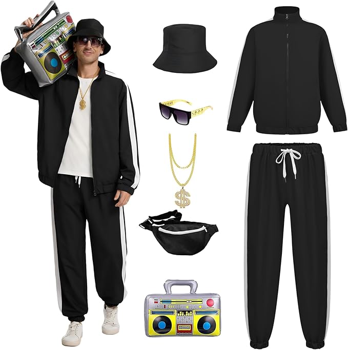 Retro 80s 90s Outfit for Men - Vintage 80s Halloween Costumes for Men-Tracksuit Set with Hip-Hop Accessories