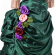 skirt adorned with vibrant floral accents. The long train adds a regal touch, making
