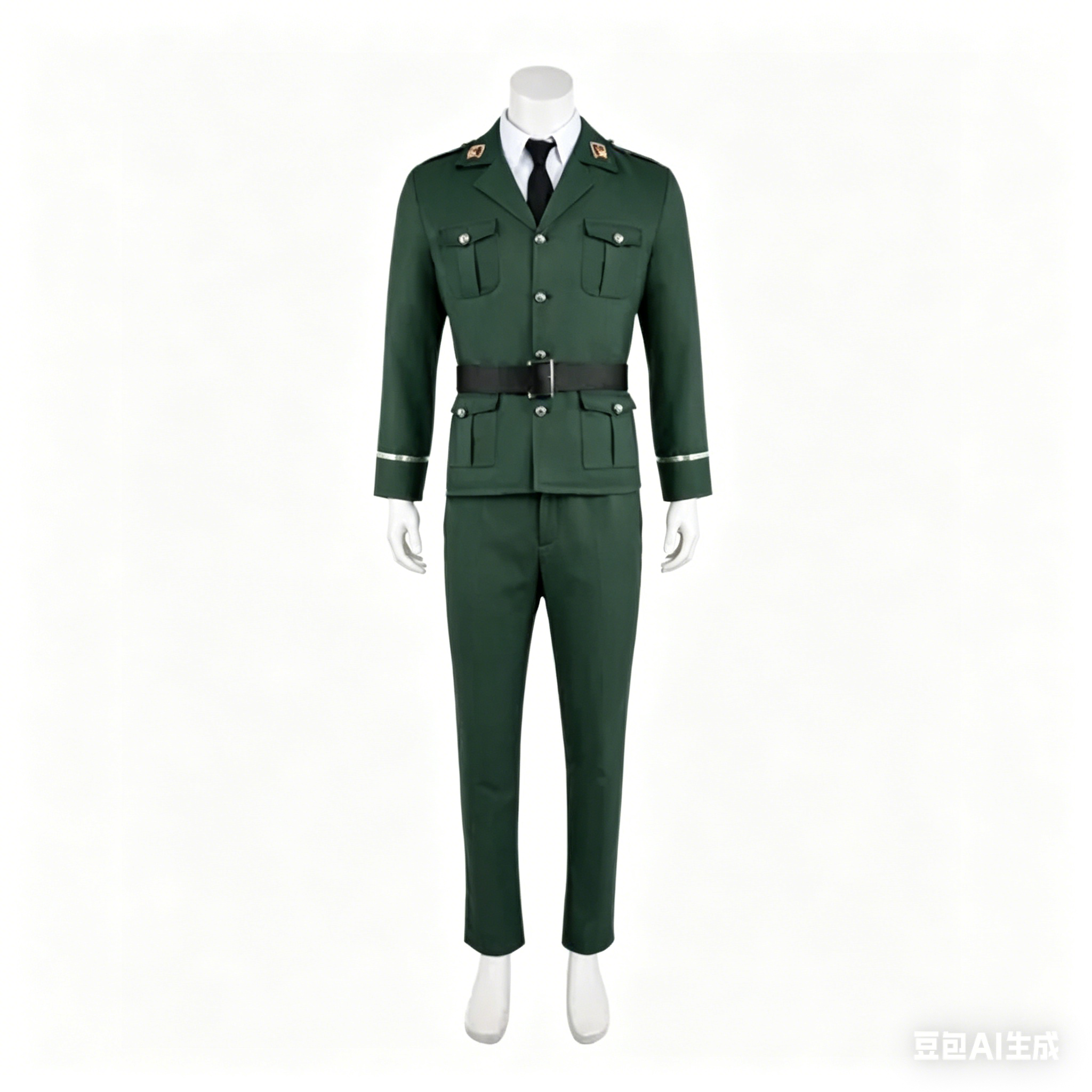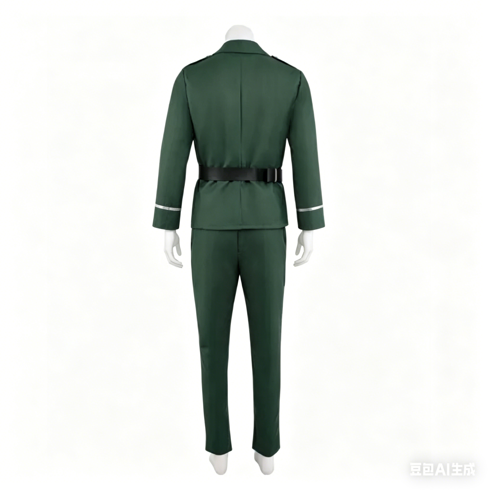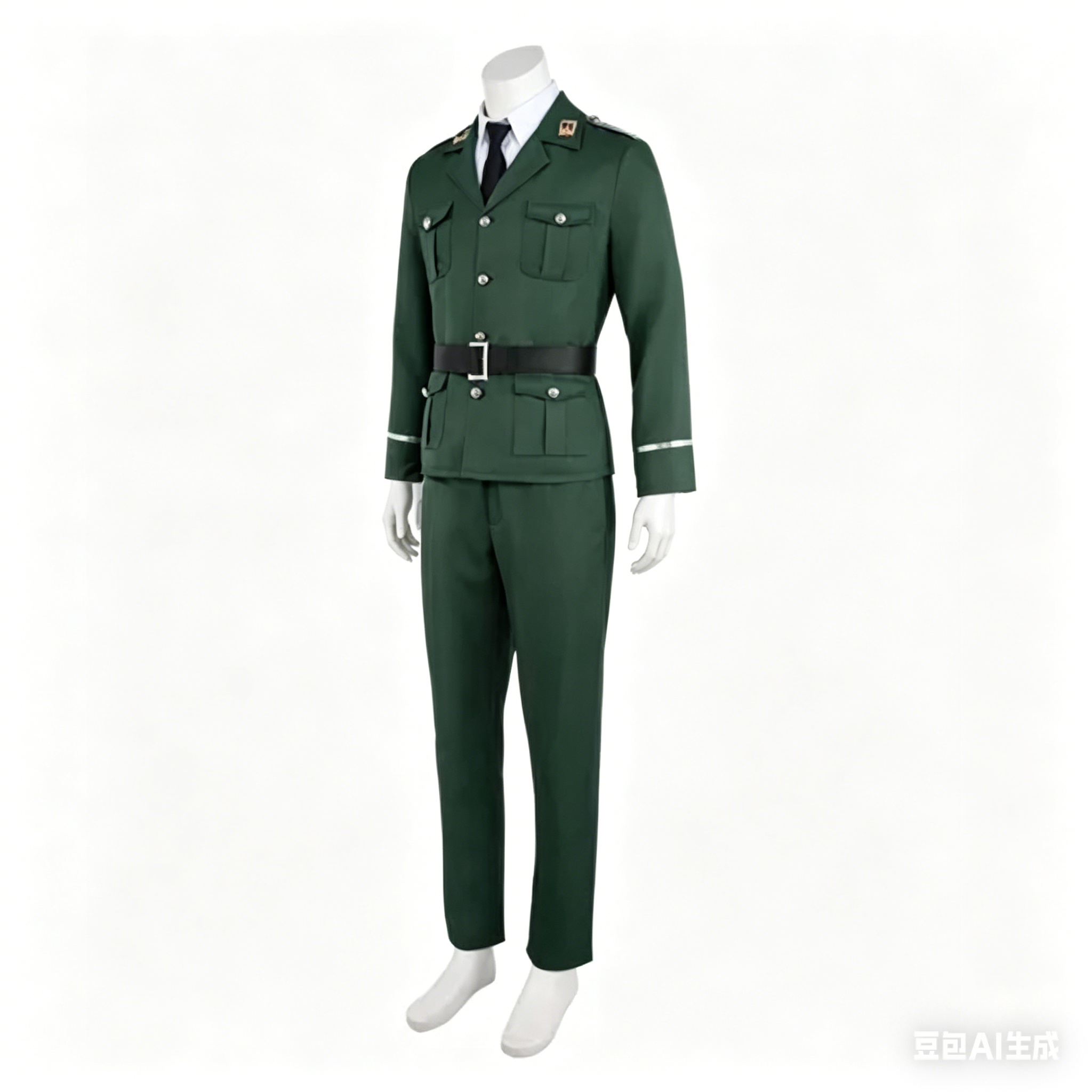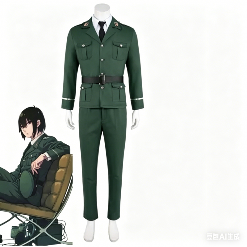 This complete cosplay set features a structured, tailored green jacket with official insignia on the collar, matching