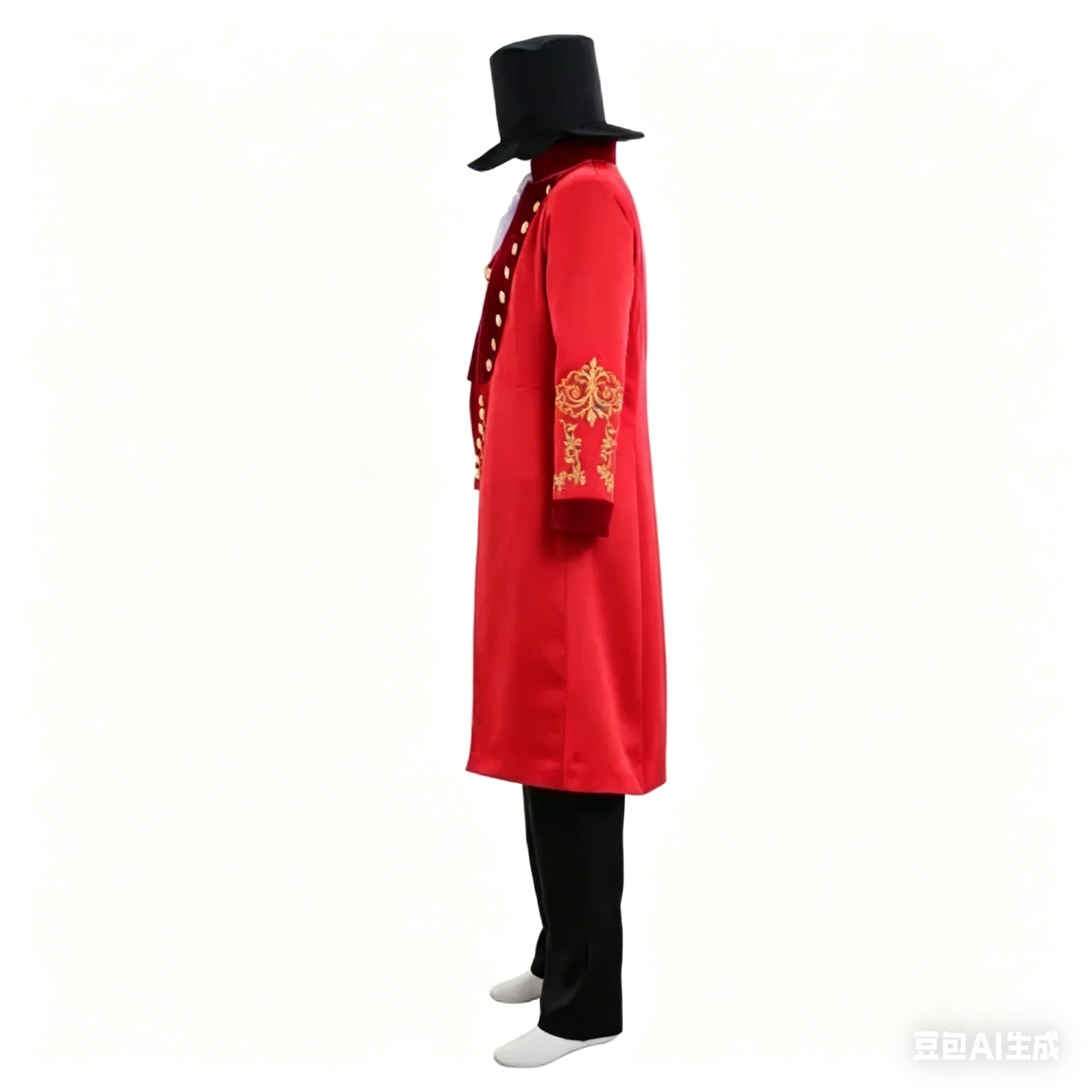 This premium cosplay outfit features a striking red tailcoat with intricate gold embroidery and velvet accents,