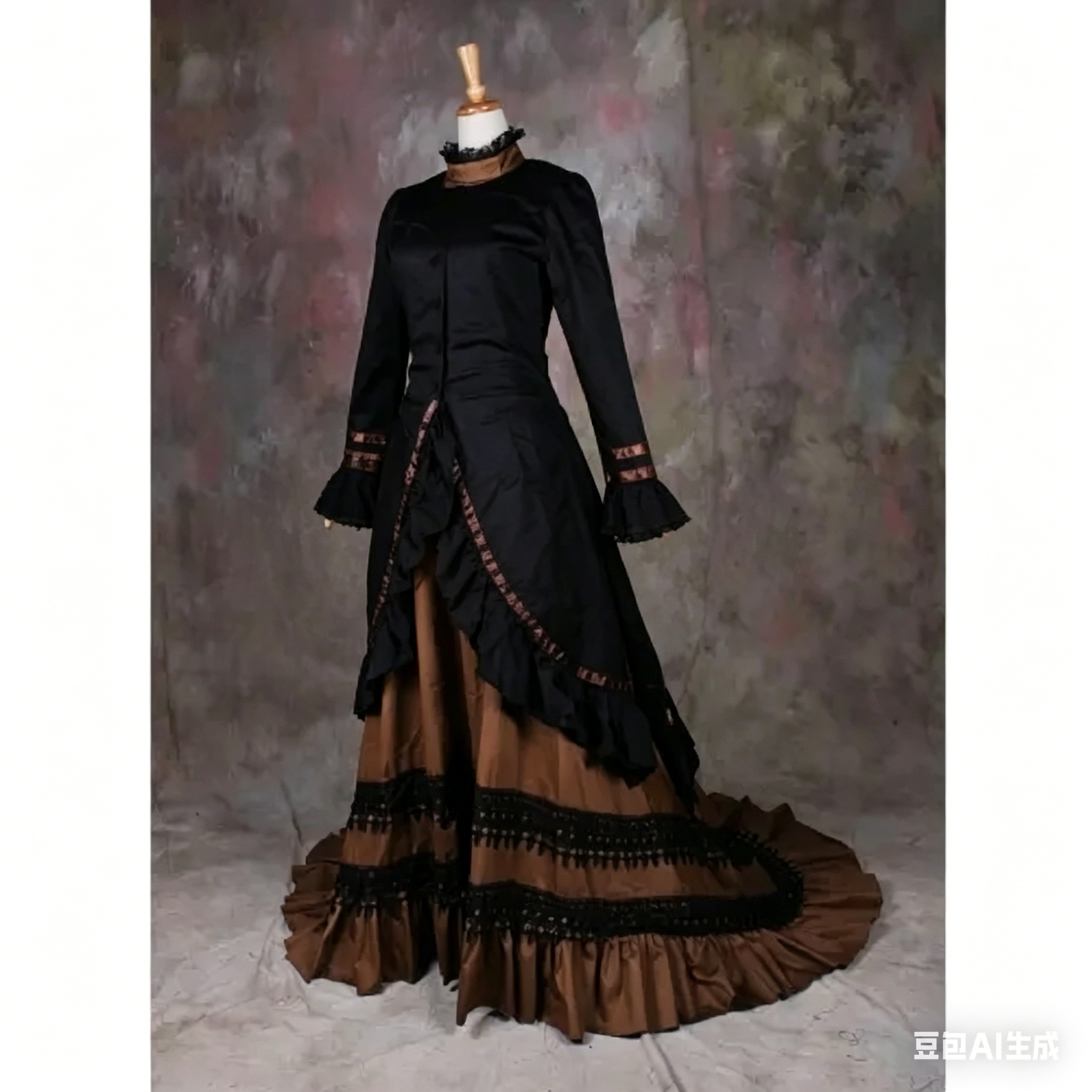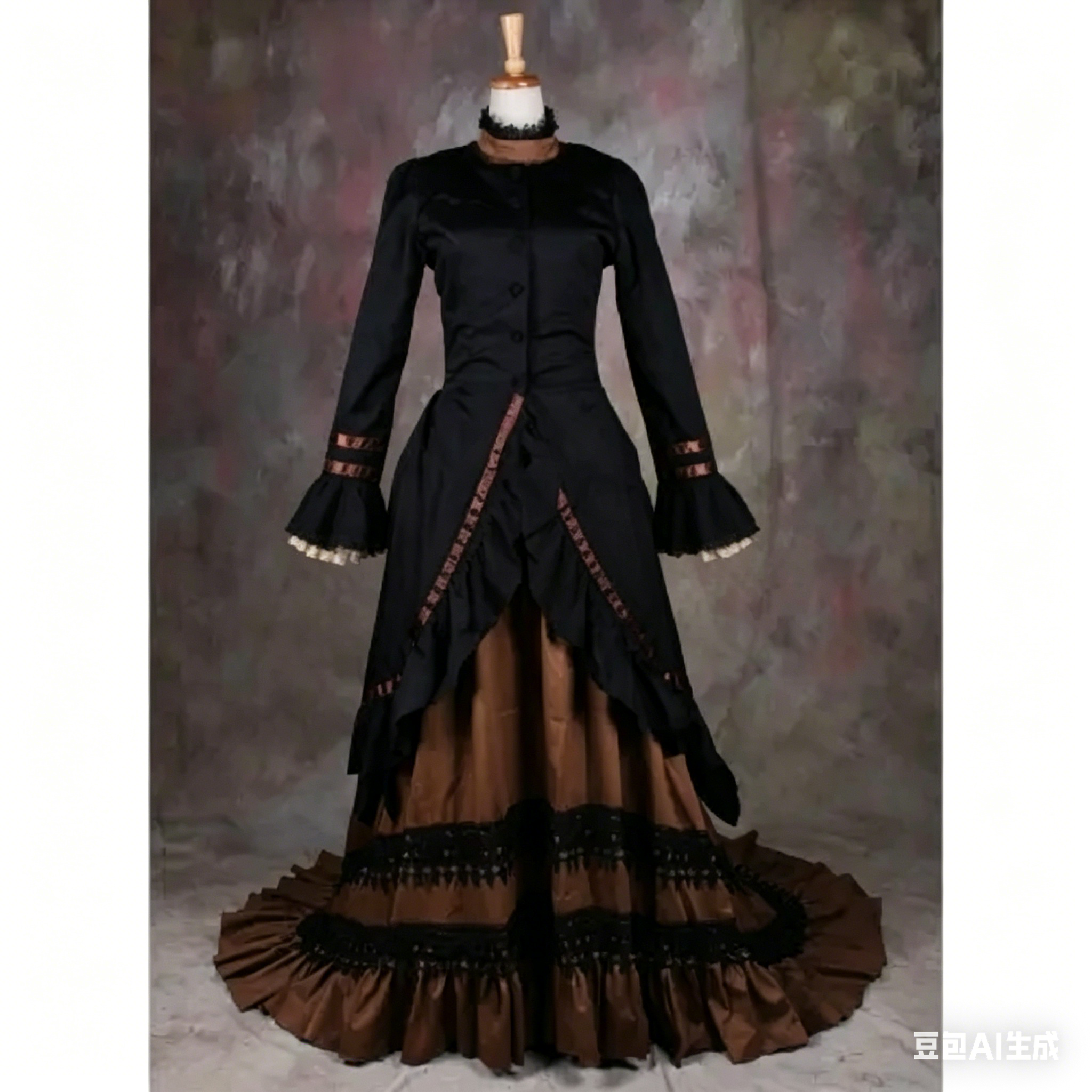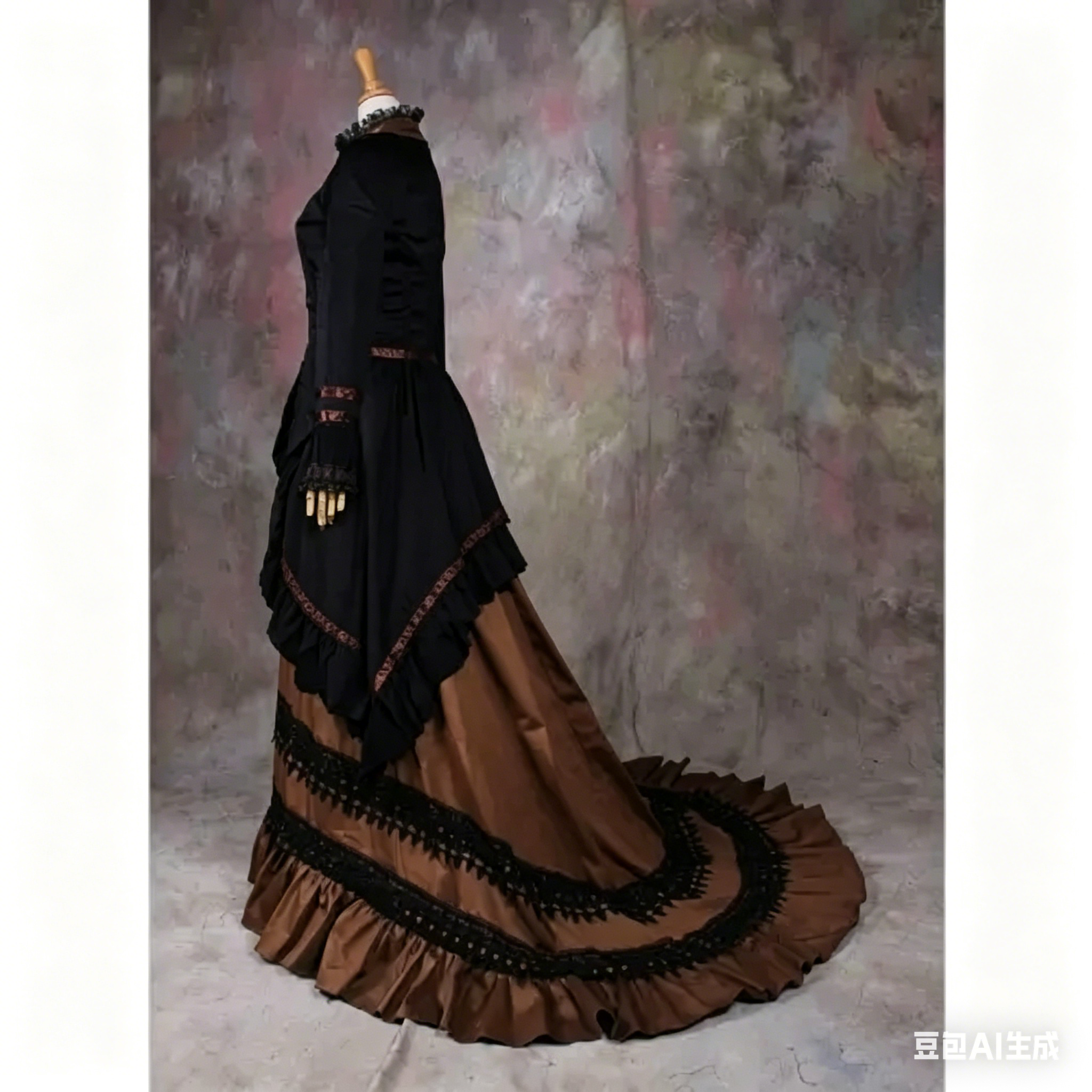 designed with authentic Victorian, Medieval and Renaissance aesthetic elements, this evening costume features a graceful flowing silhouette,
